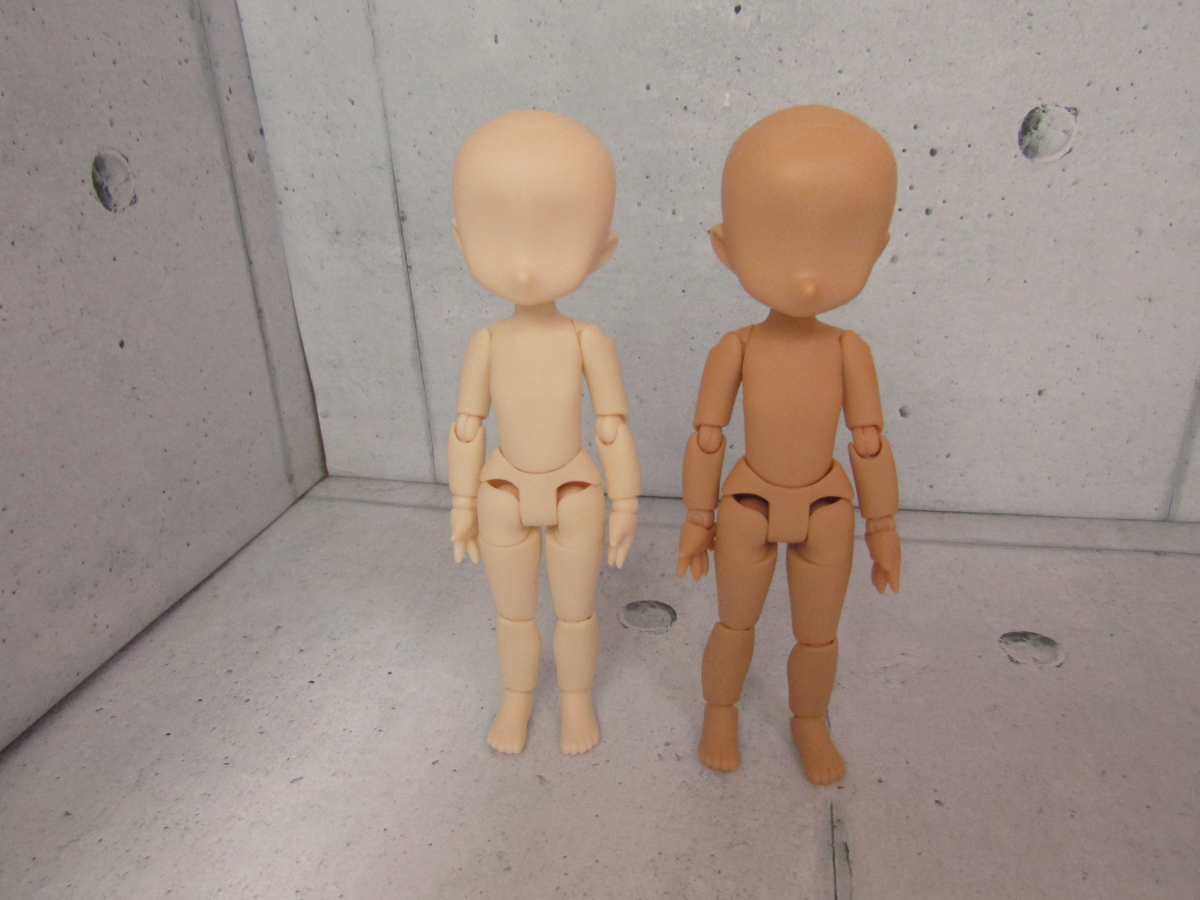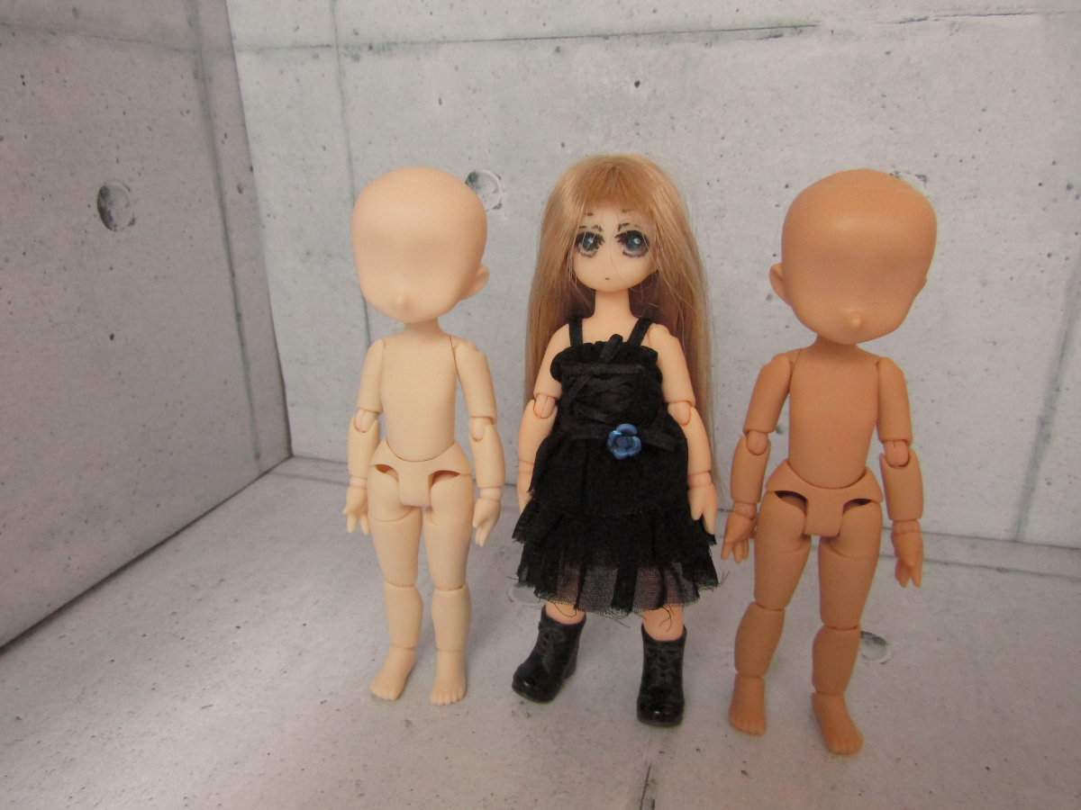 2021/10/30 Category : ドール ピコニーモP新色素体 さて、リブートも完了し平常運転の当ブログ。 本日、ピコニーモPの新色素体が到着したんで、 簡単に書いておこうと思いまして。 どうやらアゾン店頭やネット注文でも、 今後は在庫があれば普通に買える商品のようです。 時期限定とかそういうのでないのなら、ですが。 ただ気軽に手に入れられるというのはありがたいです。 ではちょっと見てみましょう。 まずコレが素体です。 今回はピコニーモPヘッドも買いました。 普段ならピコSヘッドなんですが、 素体の色に対応するヘッドの色がコレ以外ないという状況。 やむなくコレにしました。 うちにいるピコPの金髪の子をまんなかに置いてみました。 見ての通り、ピコPヘッドのほうが大きいです。 サイズ的にはDヘッドとSヘッドの中間ですが、D寄りです。 むしろ、ほぼDです。Dと言っても差し支えない。 ここからはとても重要なことなんで、 ちょっと長くなりますが書いておきます。 Dヘッドを使ったことのある方は読み飛ばしても大丈夫です。 ピコPヘッド、ピコSヘッドと違い、最初から首穴が開いてません。 調べるとピコDヘッドが同じ仕様らしいんで、 ピコSヘッドしか使ったことのない泡崎は大変戸惑いました。 Dヘッドで慣れてる方はそうでもないんでしょうが、 Sヘッドのみ使ってる方もいらっしゃると思うんで、 ここから注意喚起のためにちょっと書きます。 まず、穴がないことに驚いてください。 5分たたずんでください。途方に暮れましょう。 次に自分で穴をあける気力を持ってください。 やる気は大事です。 前に進めないまま明日を迎えるわけには行きません。 明日の自分は今日の自分より強いはず、と信じてください。 ここから針や刃物を使います。 扱いに気をつけてくださいね。 穴を開け、広げるんですけど、 カッターやデザインナイフを使う時は、 必ず後頭部方面に刃を入れてください。 顎の方に向かって入れると、力が入りすぎて一刀両断しかねないです。 そうなると修正はほぼ不可能です。後頭部にいったほうがまだマシです。 僕は危うくさっそく買ったヘッドをダメにしそうになりました。 パワーが抑えられない真性のナチュラルゴリラドールオーナーは注意です。 泡崎は真性のナチュラルゴリラドールオーナーなのでヤバかったです。 次に首穴にジョイントを差し込みます。 Sヘッドと穴の向きが違うので地味に戸惑います。 戸惑ってください。 多分、穴がスカスカになるのが嫌だと思うんで、 みなさん穴は小さめに開けると思います。 そうするとなかなか入りません。 ガーッ!!ってなります。なってください。 ガーッ!!ってなった数分後に入ると思うんで、 そこでようやく終了です。お疲れさまでした。 アゾンさん、もうちょっと手心をください。 では再び、素体の説明に戻ります。 色味ですが、こんな感じ。 タン(褐色)はかなり濃いです。 ミルキーホワイト(白)は既存のホワイトより少し白いです。 金髪の子は既存のホワイトです。 オビツ11の褐色と純白ほど色味ははっきりしてませんが、 個人的にはちょうどいいかもしれんね、という感想です。 ミルキーホワイトはもっと白くても良かったかも。 ちなみにPヘッドの頭囲は8.5センチ、 ドール者にわかりやすく言うと3.5インチぐらいらしいです。 これはパラボックスの3.5インチSサイズのウィッグがちょうど、 ということになります。さすがはパラボ。 これぐらい小さいサイズのウィッグは探すのが難しいですが、 根気よくネットで検索窓に 「ドール ウィッグ 3.5インチ」とか 「ドール ウィッグ 小さいやつ」とか 「ドール ウィッグ 大きさ 思てたんと違う」とか 色々入れてれば専門のお店も出てきます。 お洋服に関してはリブート前のピコP記事でも書いたんですが、 今は虚空の彼方へ行ってしまったんで、また書いておきます。 基本的にピコニーモ→○オビツ11、オビツ11→×ピコニーモ、 だと思っていただければわかりやすいです。 オビツ11のほうが身幅が大きいため、 アゾン製のピコ服はオビツ11にはちょっと難しいです。 が、ピコニーモがオビツ11服を着るのはさほど難しくもない、 といったところです(物とデザインにもよりますが ここでも出てくるパラボックスですが、 現在パラボではパラボックルというドールが発売されており、 こちらの体型がピコニーモと同じくらいなので、 物によっては入るものもあるかもしれません。 基本的にドール関連の流用は当然のことながらサイズによります。 どうしてもという時は針と糸とハサミが必要になります。 と、これで簡素ながらレビュー的なものは終了です。 もし手に取られる予定がありましたら、 なにかの参考になればこれ幸いと存じます。