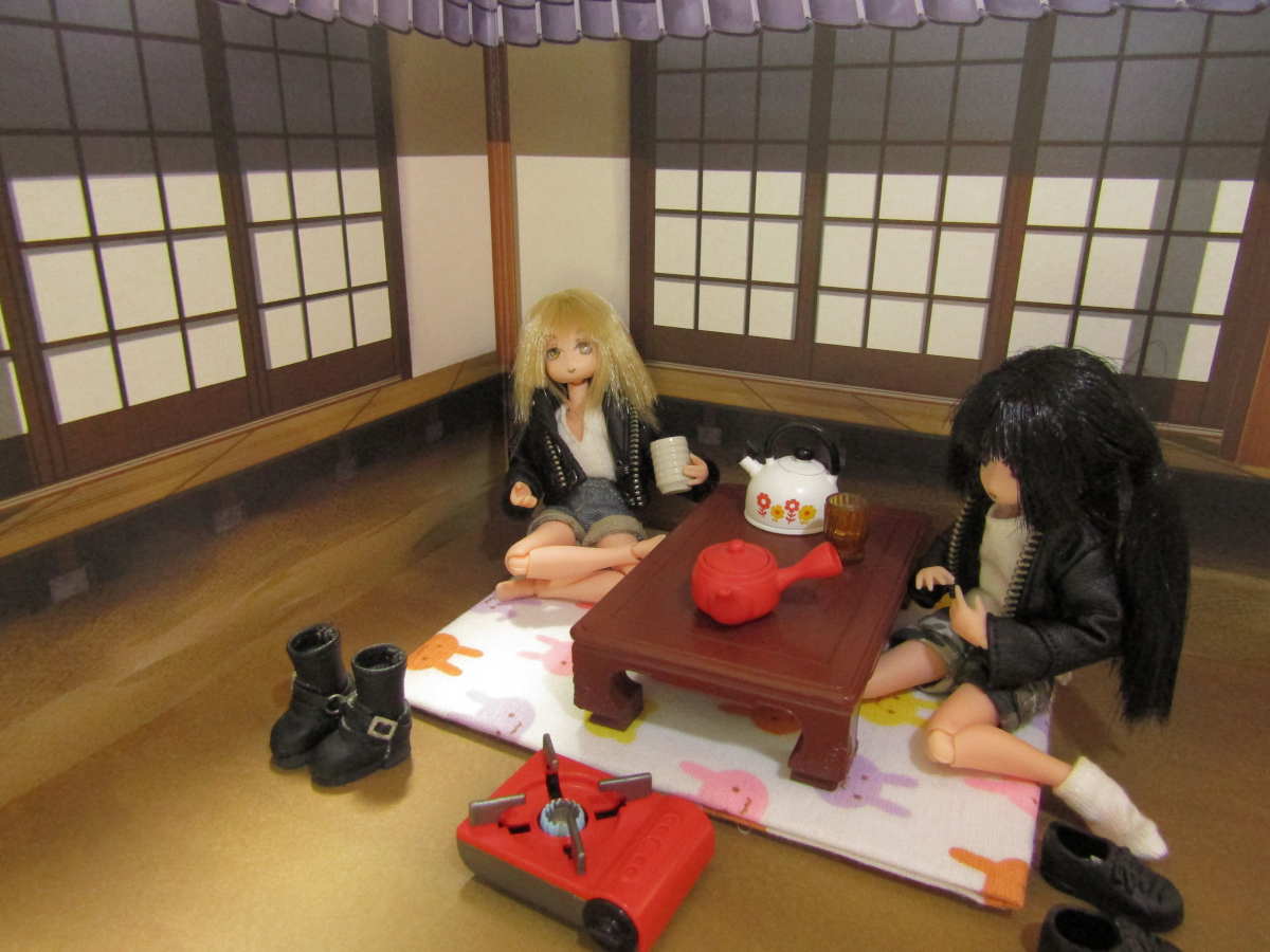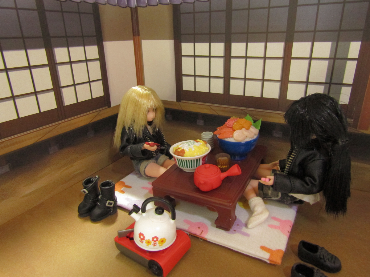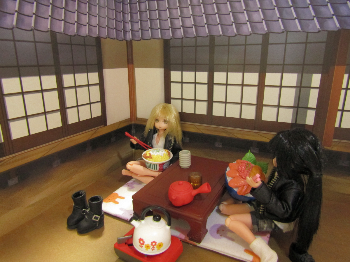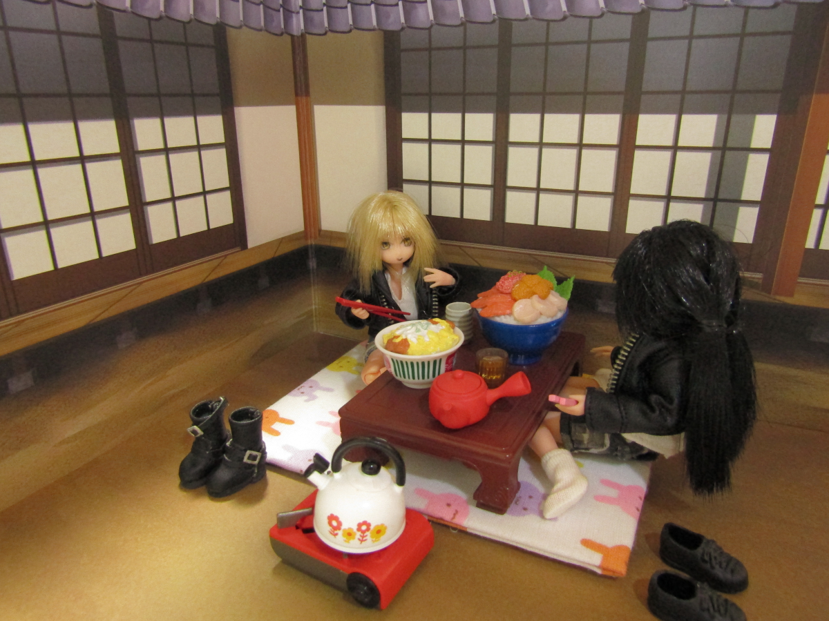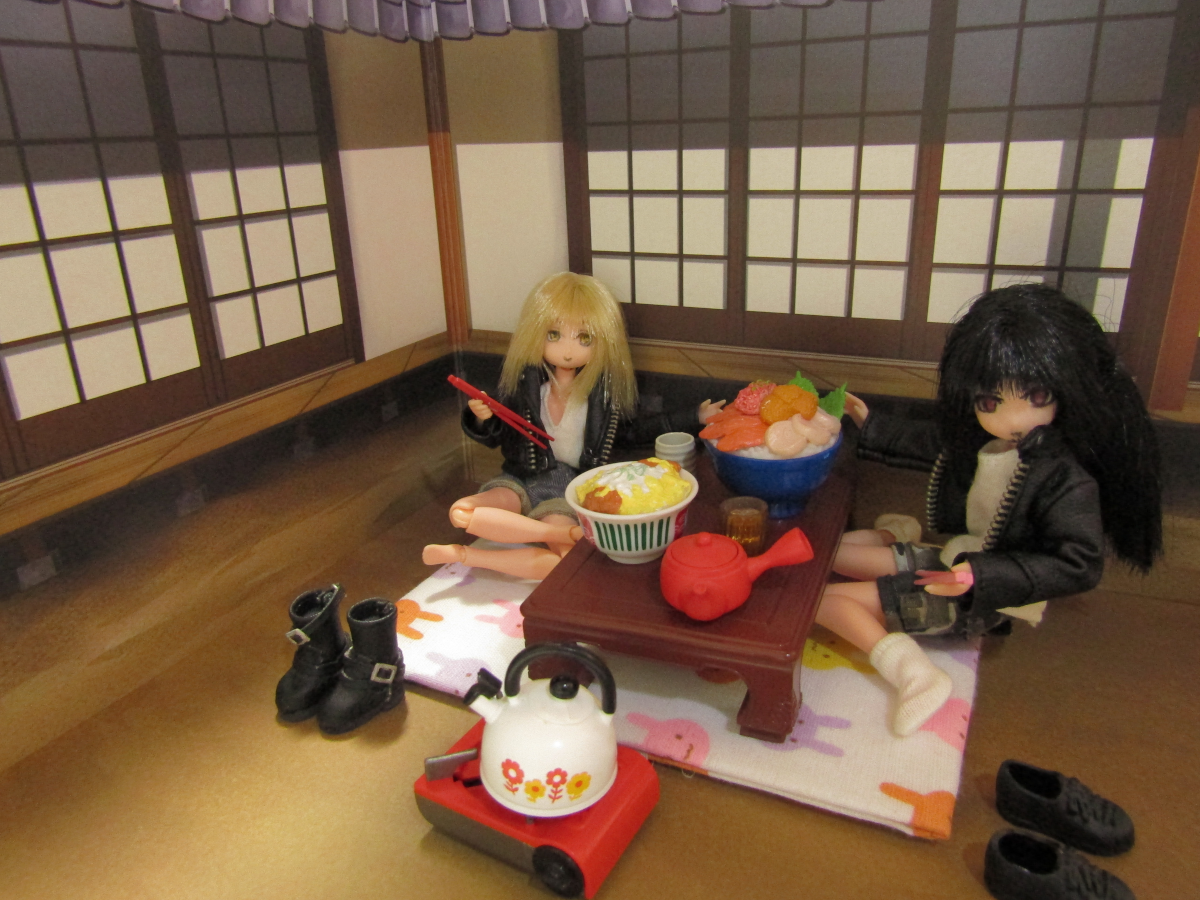 2021/11/21 Category : ドール あったかいのも今のうち アイ「やー、来た来た。腹減ったー。」 ハナちゃん「大盛りどんぶりー!しかも全品800円!」 アイ「出前までしてくれるなんてさー、採算取れんのかね?」 ハナちゃん「食べるこっちは嬉しいけどね!」 最近は出前文化が発達しています。 このコロナで「普段は出前しないようなもの」まで出前になるっていう、 独自の発達の仕方をしましたね。 良いのか悪いのかはちょっとわかりませんが、 ユーザーにとっては悪い話ではないでしょうな。 ハナちゃん「お外で食べるのいいねー。」 アイ「なー。開放的だぜ。」 ハナちゃん「居間からテーブル持ってきた甲斐があったね!」 アイ「うちのテーブル、古いから微妙に重いんだよなー。」 食べ終わったらまた元に戻すことまでは考えてない様子。 アイ「んじゃ、食べるか!」 ハナちゃん「うん!」 アイ・ハナちゃん「いただきまーす。」 アイ「うめぇうめぇ。」 ハナちゃん「おいしいおいしい。」 アイ「これでなー、キレイな花でも咲いてりゃお花見って感じなのにな。」 ハナちゃん「もう冬になるからなーんも咲いてないね。」 アイ「なんか惜しいな。」 ハナちゃん「あ、でもでも!紅葉!あっちの木、紅葉してる!」 アイ「ま、これもまたいいかー。」 今がシーズンの紅葉狩り。 泡崎の住む千葉もだいぶ紅葉が進んできました。 いちょうの木がキレイです。 アイ「食ったー。」 ハナちゃん「おいしかったー。」 アイ・ハナちゃん「ごちそうさまー。」 ハナちゃん「今年はあったかいから外で食べるのもヤじゃないね。」 アイ「まぁあったけーのはいいけどなー。」 ハナちゃん「あ、ねこ来た。」 アイ「なんだー、もうなんもねぇぞー。」 ハナちゃん「もうちょっと早ければ海鮮丼のお刺身あげたのにね。」 アイ「あーさてはお前、ちょっとトロいやつだろ! 他のねこに出し抜かれるタイプの!」 のらねこ「なーぅ。」 そて、そろそろ本格的に冬になります。 お外でご飯を食べられるのもこのへんまででしょう。 寒くなるとちょっと厳しいですよね。 みなさんも暖かいところで過ごしたほうがいいですよ。 お風邪などひかぬよう、お気をつけくださいなー。