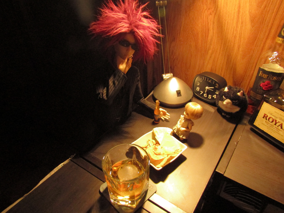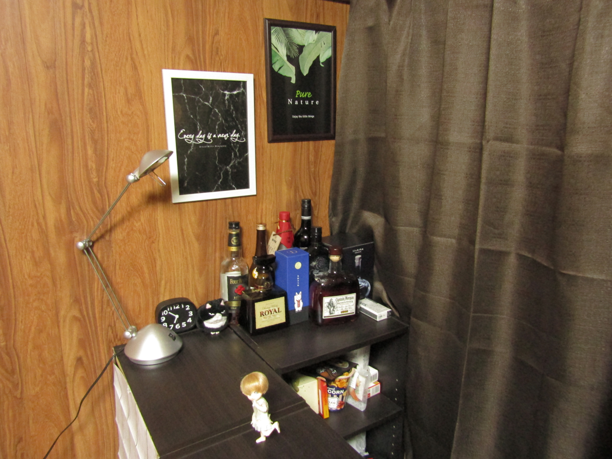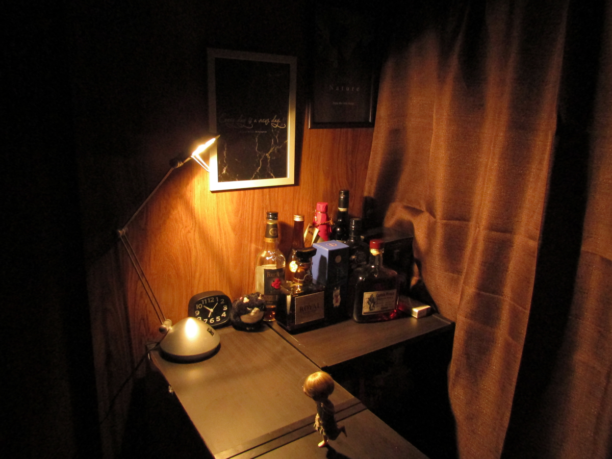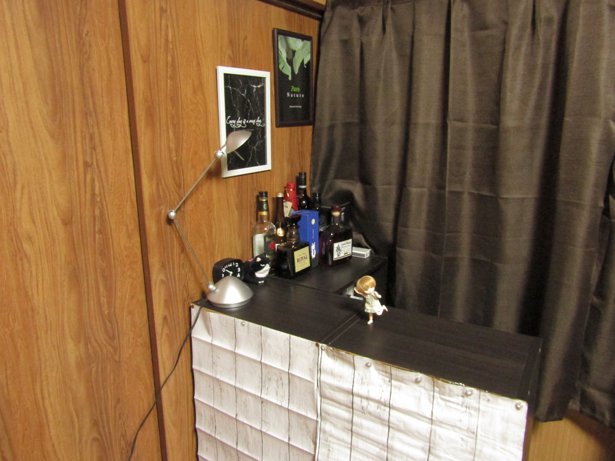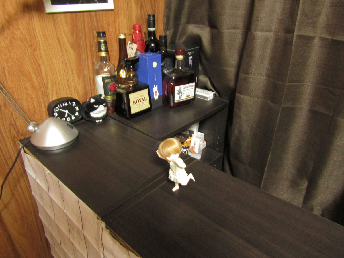 2021/12/22 Category : ドール 自宅BAR 今回は、カテゴリーこそドールですが、 もちろんドールも出てきますが、 基本的に関係ない話をします。 某、泡崎。 酒好きが高じて部屋にバーカウンターっぽいものを作りました。 それが、コレです。 まぁ、バーカウンターというには少々安い感じですが。 安いのは当たり前。 ご覧の通り、カラーボックスを三連結しただけのものですんで。 中に入るとちょうどマスター(泡崎)一人分。 お客さん側は二人分くらいです。 立呑みです。椅子など許されません。 スパルタ式飲酒です。 酔いつぶれたら床に寝ろ!!!! 椅子はあります。疲れたら腰掛けてね。 これは部屋の明かりで撮ったもの。 ただの泡崎の部屋にただのカラーボックスがただ置いてあって、 ただ酒がただ並んでるだけの、ただの部屋の一角。 なんかそれっぽい何書いてんだか判らない雰囲気だけの絵入り額縁を これでもかと飾ってみたけど、普通の部屋の片隅。 電気スタンドあるじゃないですか、そこに。 スイッチオンですよ、スイッチオン。 途端になんかそれっぽい雰囲気に。 すごいぜ間接照明マジック。 (BGM:EGO-WRAPPIN'の色彩のブルース) お酒の方はウイスキーから焼酎から日本酒からワインから何でもあり。 友人を招くこともあるんで、ちょっと普段飲まないようなお酒もあります。 飲むとこんな感じ。 オイオイオイ、雰囲気だけで一生飲んでられるわ。 なんなんで、トラさん配置してみました。 BARっぽいじゃん。 なんかしなびた感じが出てる出てる。 場末のBARっぽさ出てる出てる。 思いつきから4時間で作りました。 家にあるもの使ってるんで短時間で出来ましたよ。 人間、暇になると何か面白いことがしたくなるようで、 異様なまでの行動力と、異様なまでの節約精神で完成した、 僕だけのBARです。やるじゃん。 「クソッタレBAR 泡崎くん」 という名前にしました。 友人を呼んでみたところ、意外と好評だったので良かったです。 出来てからというもの、2日に1回、いや1.5日に1回、 正直に言うと毎晩ここで飲んでます。酒を。 みなさんもカラーボックスが3つあったらやってみましょう。